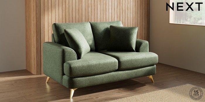 7.3.1 Buy Parker 2 Seater Small Sofa Boucle Chenille Dark Moss Green High Metal - Brass from the Next UK online shop Click here to use our accessible website