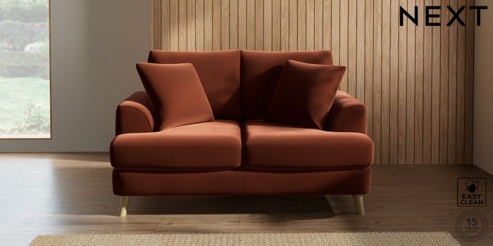 7.2.5 Buy Parker 2 Seater Small Sofa Plush Velvet Easy Clean Ginger Orange Low Retro Tapered - Light from the Next UK online shop Click here to use our accessible website