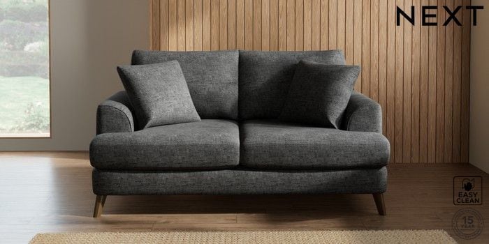 7.2.5 Buy Parker 3 Seater Small Sofa Boucle Weave Easy Clean Charcoal Grey Low Retro Tapered - Mid from the Next UK online shop Click here to use our accessible website