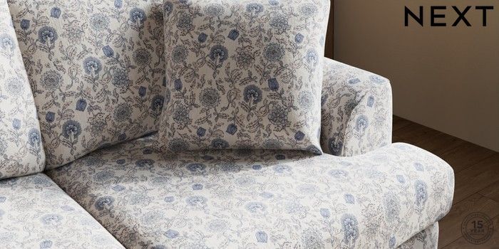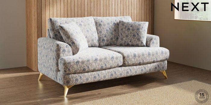 7.3.1 Buy Parker 3 Seater Small Sofa Relaxed Linen Look Print Woodblock Floral Blue High Metal - Brass from the Next UK online shop