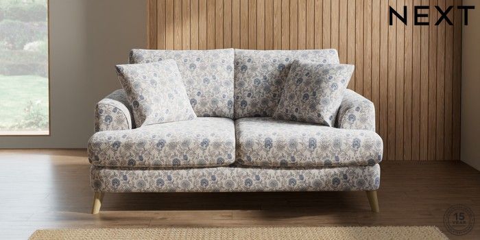 7.3.1 Buy Parker 3 Seater Small Sofa Relaxed Linen Look Print Woodblock Floral Blue Low Retro Tapered - Light from the Next UK online shop Click here to use our accessible website