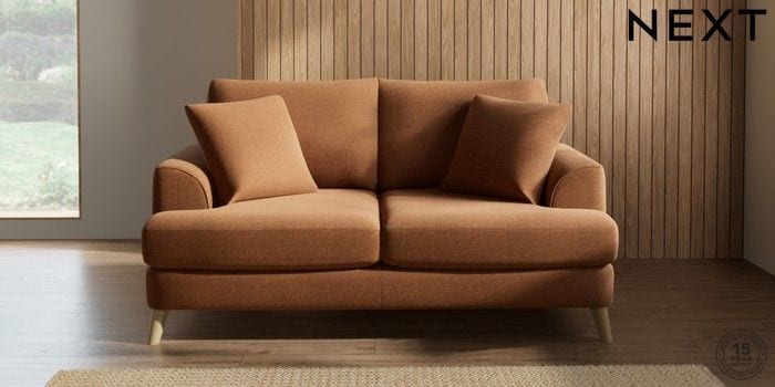 7.2.5 Buy Parker 3 Seater Small Sofa Ripple Chenille Mid Rust Brown Low Retro Tapered - Light from the Next UK online shop Click here to use our accessible website