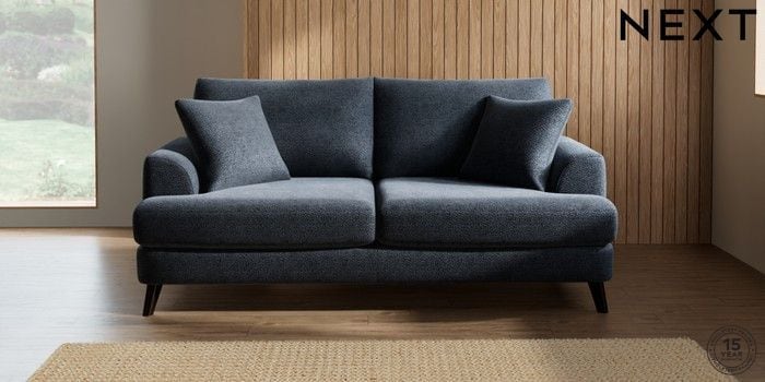 7.0.3 Buy Parker 3 Seater Sofa Boucle Chenille Dark Slate Blue Low Retro Tapered - Dark from the Next UK online shop Click here to use our accessible website