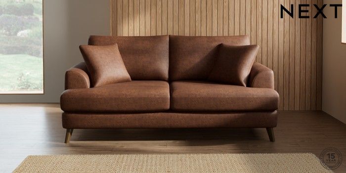 7.2.5 Buy Parker 3 Seater Sofa Monza Faux Leather Easy Clean Chestnut Brown Low Retro Tapered - Mid from the Next UK online shop Click here to use our accessible website