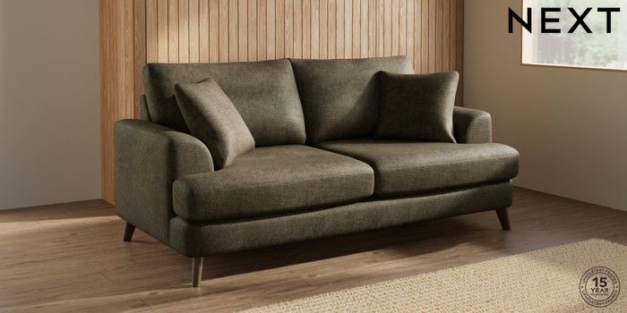 7.3.1 Buy Parker 3 Seater Sofa Plush Chenille Moss Green Low Retro Tapered - Mid from the Next UK online shop Click here to use our accessible website