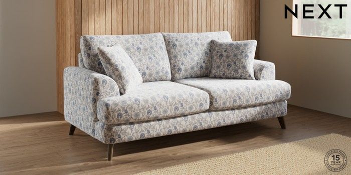 7.3.1 Buy Parker 3 Seater Sofa Relaxed Linen Look Print Woodblock Floral Blue Low Retro Tapered - Mid from the Next UK online shop