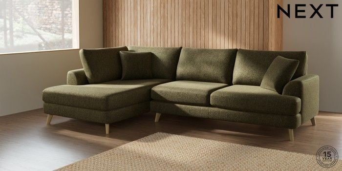 7.2.4 Buy Parker Large Corner Chaise - Left Hand Cotswold Chenille Dark Green Low Retro Tapered - Light from the Next UK online shop Click here to use our accessible website