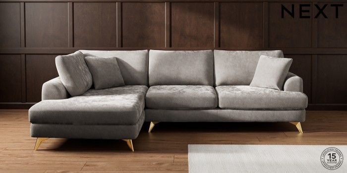 7.3.1 Buy Parker Large Corner Chaise - Left Hand Distressed Velour French Grey High Metal - Brass from the Next UK online shop Click here to use our accessible website