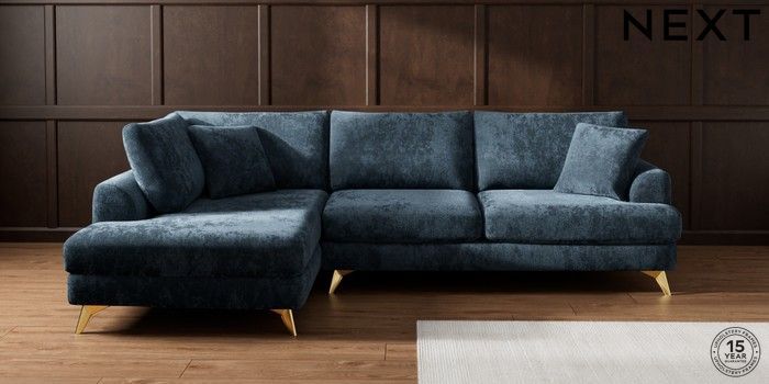 7.2.10 Buy Parker Large Corner Chaise - Left Hand Distressed Velour Midnight Blue High Metal - Brass from the Next UK online shop Click here to use our accessible website