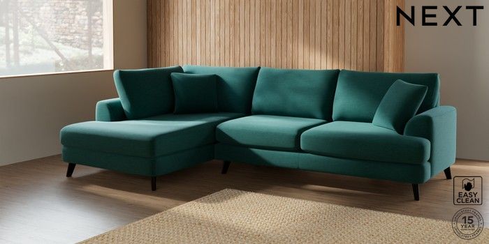 7.2.5 Buy Parker Large Corner Chaise - Left Hand Fine Chenille Easy Clean Dark Juniper Green Low Retro Tapered - Dark from the Next UK online shop Click here to use our accessible website