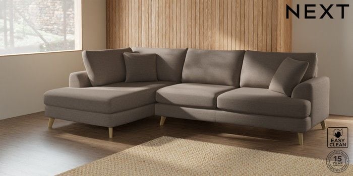 7.2.4 Buy Parker Large Corner Chaise - Left Hand Fine Chenille Easy Clean Mid Taupe Brown Low Retro Tapered - Light from the Next UK online shop Click here to use our accessible website