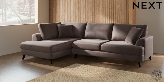7.2.4 Buy Parker Large Corner Chaise - Left Hand Luxe Chenille Mink Brown Low Retro Tapered - Dark from the Next UK online shop Click here to use our accessible website