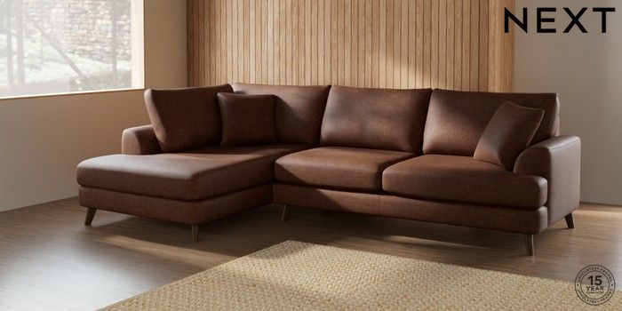 7.2.5 Buy Parker Large Corner Chaise - Left Hand Monza Faux Leather Easy Clean Chestnut Brown Low Retro Tapered - Mid from the Next UK online shop Click here to use our accessible website