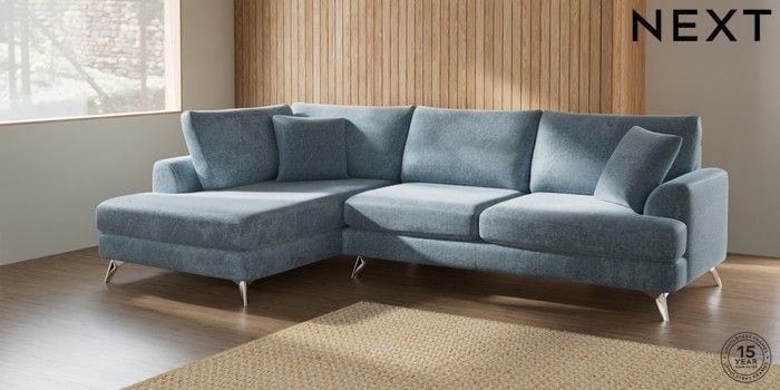 7.2.6 Buy Parker Large Corner Chaise - Left Hand Plush Chenille Light Blue High Metal - Chrome from the Next UK online shop Click here to use our accessible website