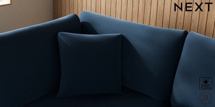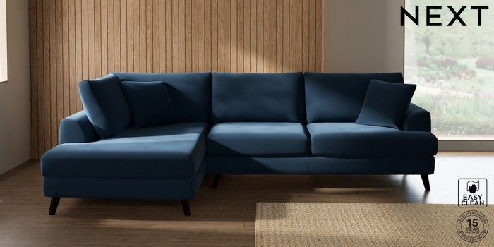 7.2.10 Buy Parker Large Corner Chaise - Left Hand Plush Velvet Easy Clean Airforce Blue Low Retro Tapered - Dark from the Next UK online shop Click here to use our accessible website