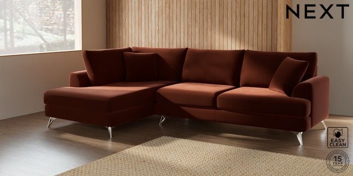 7.2.5 Buy Parker Large Corner Chaise - Left Hand Plush Velvet Easy Clean Ginger Orange High Metal - Chrome from the Next UK online shop Click here to use our accessible website