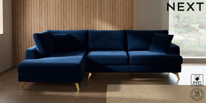 7.3.1 Buy Parker Large Corner Chaise - Left Hand Plush Velvet Easy Clean Navy Blue High Metal - Brass from the Next UK online shop Click here to use our accessible website