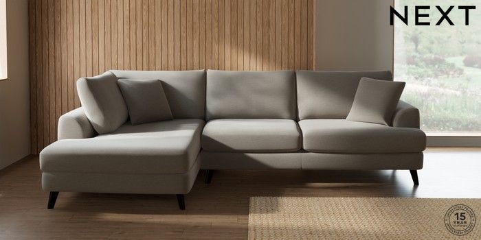 7.2.10 Buy Parker Large Corner Chaise - Left Hand Ripple Chenille Light Natural Low Retro Tapered - Dark from the Next UK online shop Click here to use our accessible website