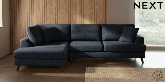 7.3.1 Buy Parker Large Corner Chaise - Left Hand Tweedy Chenille Navy Blue Low Retro Tapered - Mid from the Next UK online shop Click here to use our accessible website
