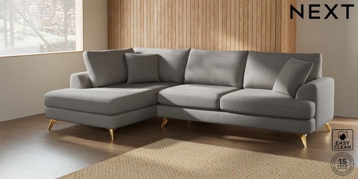 7.2.5 Buy Parker Large Corner Chaise - Left Hand Woven Chenille Easy Clean Light Grey High Metal - Brass from the Next UK online shop Click here to use our accessible website