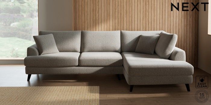 7.3.1 Buy Parker Large Corner Chaise - Right Hand Chunky Boucle Easy Clean Dove Low Retro Tapered - Dark from the Next UK online shop Click here to use our accessible website