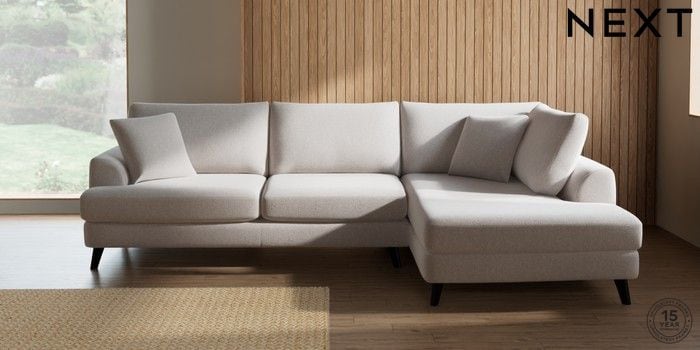 7.3.1 Buy Parker Large Corner Chaise - Right Hand Cotswold Chenille Oyster Low Retro Tapered - Dark from the Next UK online shop Click here to use our accessible website