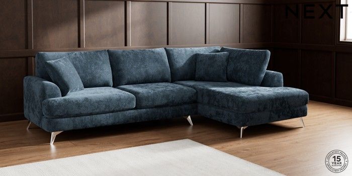 7.2.5 Buy Parker Large Corner Chaise - Right Hand Distressed Velour Midnight Blue High Metal - Chrome from the Next UK online shop Click here to use our accessible website