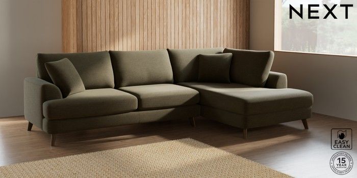 7.2.5 Buy Parker Large Corner Chaise - Right Hand Fine Chenille Easy Clean Dark Moss Green Low Retro Tapered - Mid from the Next UK online shop Click here to use our accessible website