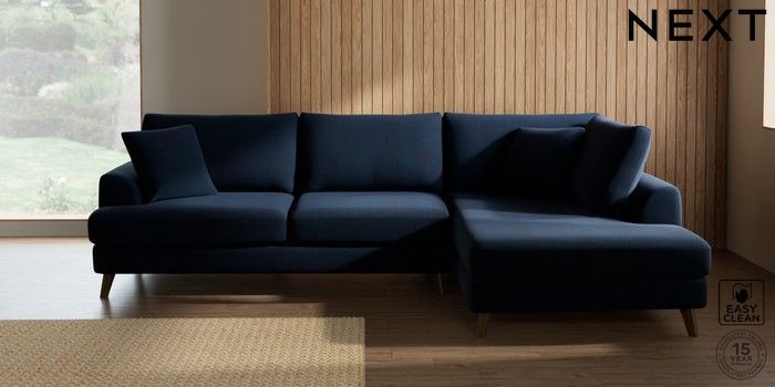 7.3.1 Buy Parker Large Corner Chaise - Right Hand Fine Chenille Easy Clean Dark Navy Blue Low Retro Tapered - Mid from the Next UK online shop Click here to use our accessible website