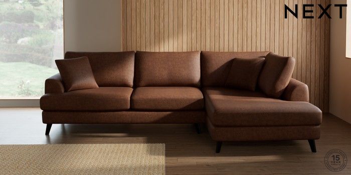 7.3.1 Buy Parker Large Corner Chaise - Right Hand Monza Faux Leather Easy Clean Chestnut Brown Low Retro Tapered - Dark from the Next UK online shop Click here to use our accessible website