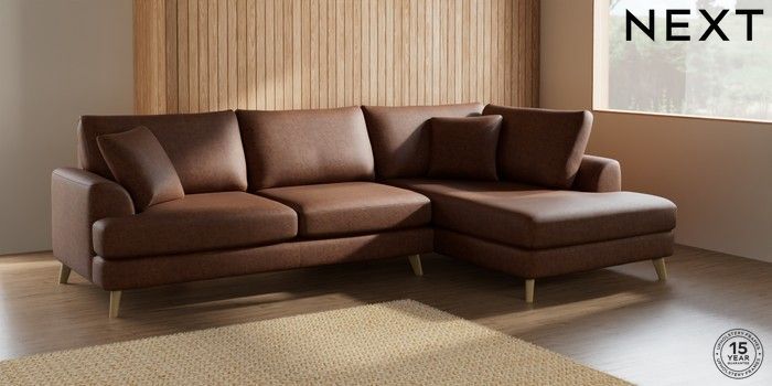 7.2.5 Buy Parker Large Corner Chaise - Right Hand Monza Faux Leather Easy Clean Chestnut Brown Low Retro Tapered - Light from the Next UK online shop Click here to use our accessible website