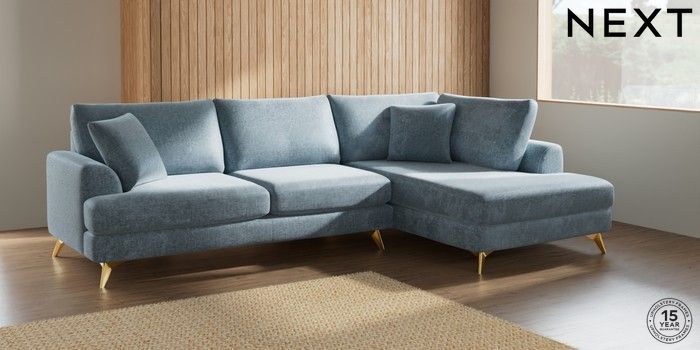 7.2.6 Buy Parker Large Corner Chaise - Right Hand Plush Chenille Light Blue High Metal - Brass from the Next UK online shop Click here to use our accessible website