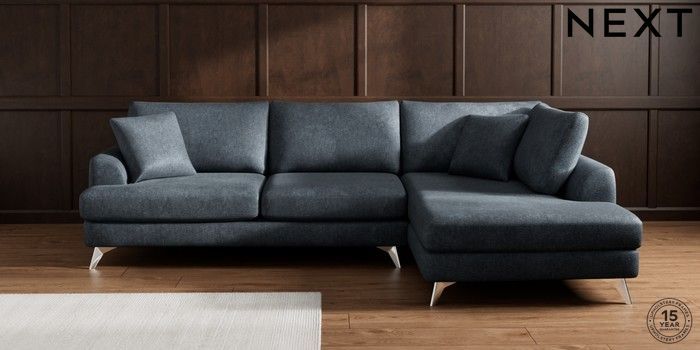 7.2.10 Buy Parker Large Corner Chaise - Right Hand Plush Chenille Slate Blue High Metal - Chrome from the Next UK online shop Click here to use our accessible website