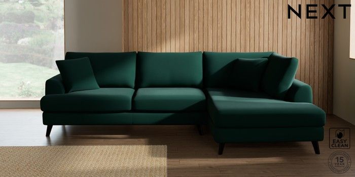 7.3.1 Buy Parker Large Corner Chaise - Right Hand Plush Velvet Easy Clean Bottle Green Low Retro Tapered - Dark from the Next UK online shop Click here to use our accessible website