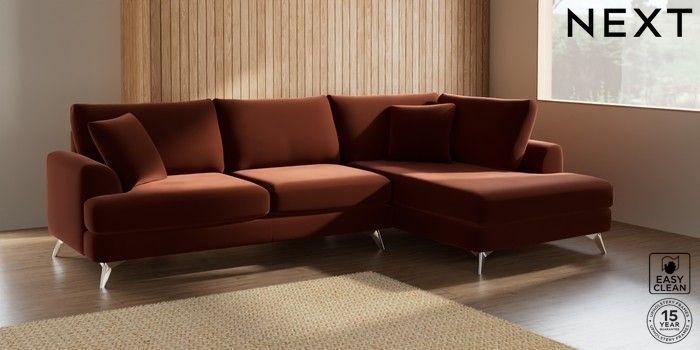 7.2.5 Buy Parker Large Corner Chaise - Right Hand Plush Velvet Easy Clean Ginger Orange High Metal - Chrome from the Next UK online shop Click here to use our accessible website
