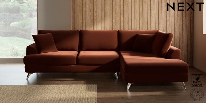 7.3.1 Buy Parker Large Corner Chaise - Right Hand Plush Velvet Easy Clean Ginger Orange High Metal - Chrome from the Next UK online shop Click here to use our accessible website