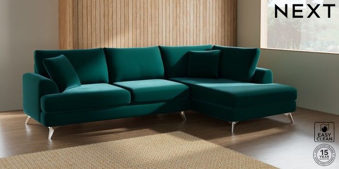 7.2.5 Buy Parker Large Corner Chaise - Right Hand Plush Velvet Easy Clean Juniper Green High Metal - Chrome from the Next UK online shop Click here to use our accessible website