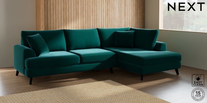7.2.4 Buy Parker Large Corner Chaise - Right Hand Plush Velvet Easy Clean Juniper Green Low Retro Tapered - Dark from the Next UK online shop Click here to use our accessible website