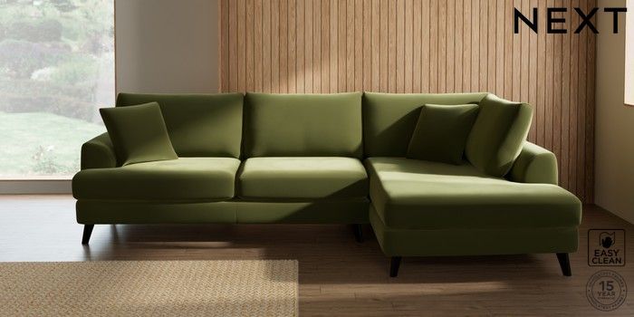7.3.1 Buy Parker Large Corner Chaise - Right Hand Plush Velvet Easy Clean Mid Olive Green Low Retro Tapered - Dark from the Next UK online shop Click here to use our accessible website