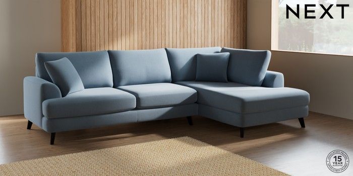 7.2.5 Buy Parker Large Corner Chaise - Right Hand Relaxed Linen Look Mid Blue Low Retro Tapered - Dark from the Next UK online shop Click here to use our accessible website