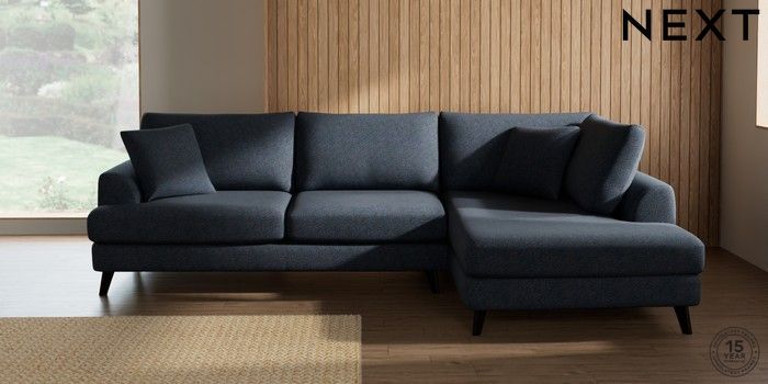 7.3.1 Buy Parker Large Corner Chaise - Right Hand Tweedy Chenille Navy Blue Low Retro Tapered - Dark from the Next UK online shop Click here to use our accessible website