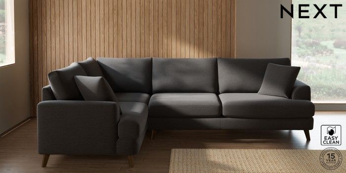 7.2.10 Buy Parker Large Corner Sofa - Left Hand Fine Chenille Easy Clean Dark Smoke Grey Low Retro Tapered - Mid from the Next UK online shop Click here to use our accessible website