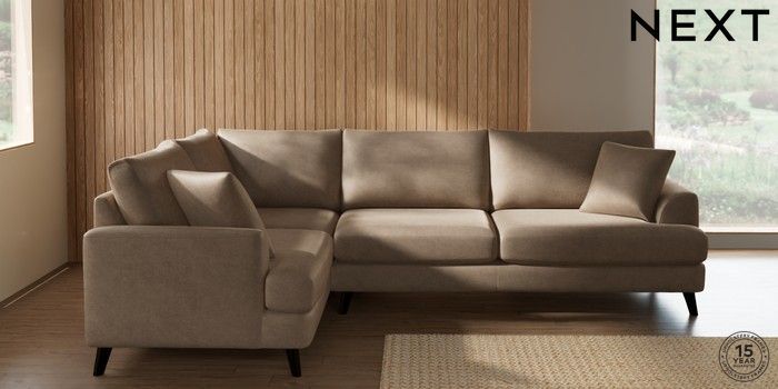 7.2.10 Buy Parker Large Corner Sofa - Left Hand Luxe Chenille Mid Camel Beige Low Retro Tapered - Dark from the Next UK online shop Click here to use our accessible website
