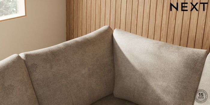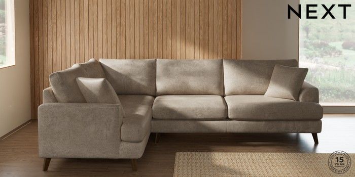 7.2.10 Buy Parker Large Corner Sofa - Left Hand Plush Chenille Light Natural Low Retro Tapered - Mid from the Next UK online shop Click here to use our accessible website