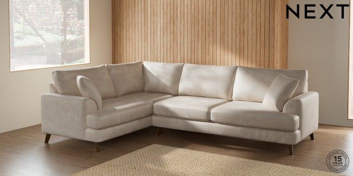 7.2.5 Buy Parker Large Corner Sofa - Left Hand Plush Chenille Oyster Low Retro Tapered - Mid from the Next UK online shop Click here to use our accessible website