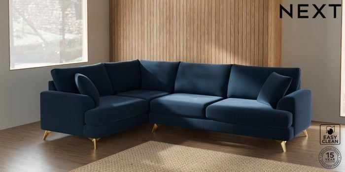 7.2.5 Buy Parker Large Corner Sofa - Left Hand Plush Velvet Easy Clean Airforce Blue High Metal - Brass from the Next UK online shop Click here to use our accessible website