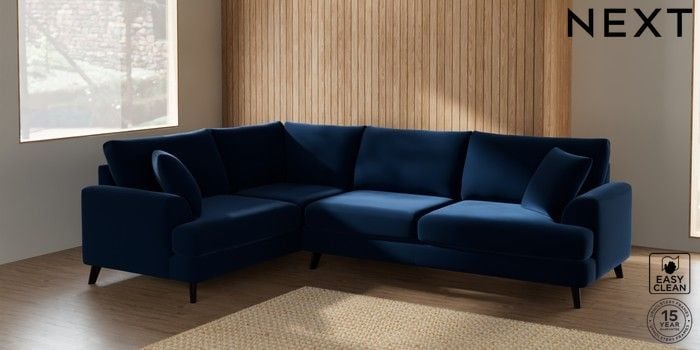 7.2.5 Buy Parker Large Corner Sofa - Left Hand Plush Velvet Easy Clean Navy Blue Low Retro Tapered - Dark from the Next UK online shop Click here to use our accessible website
