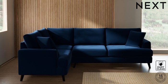7.3.1 Buy Parker Large Corner Sofa - Left Hand Plush Velvet Easy Clean Navy Blue Low Retro Tapered - Dark from the Next UK online shop Click here to use our accessible website