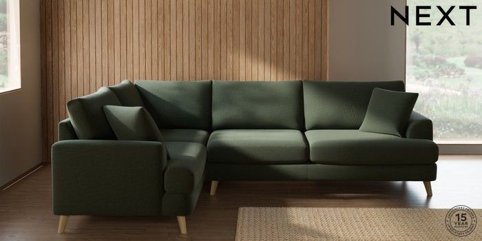 7.2.10 Buy Parker Large Corner Sofa - Left Hand Relaxed Linen Look Dark Green Low Retro Tapered - Light from the Next UK online shop Click here to use our accessible website