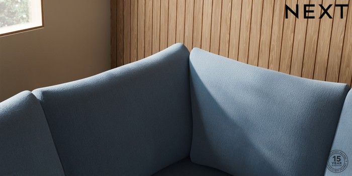 7.2.10 Buy Parker Large Corner Sofa - Left Hand Relaxed Linen Look Mid Blue Low Retro Tapered - Light from the Next UK online shop Click here to use our accessible website